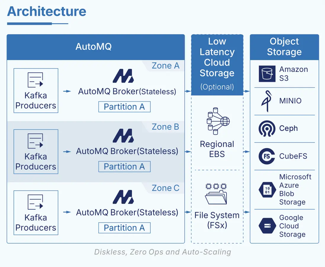 今天,我們正式宣佈:繼 S3 WAL、EBS/Regional EBS WAL[1] 之後,AutoMQ 將在 2025 年的 12 月的新版本中全面支持以 AWS FSx 作為新的 WAL 存儲選項。AutoMQ 本身是一款完全兼容 Apache Kafka 協議、基於 S3 對象存儲構建的新一代 Diskless Kafka,通過自研的「WAL + 對象存儲」創新流存儲引擎,將寫入日誌與大規模持久化存儲解耦,在保證 Kafka 語義和穩定性的同時,大幅降低存儲成本、簡化運維,並已在行業內獲得廣泛認可。隨着 FSx WAL 的引入,AWS 上的 AutoMQ 終於補齊了關鍵的一塊拼圖:在 AWS 上,你可以在一套真正 Diskless 的 Kafka 方案中,同時兼顧消除跨 AZ 流量成本、多 AZ 級別容災能力以及接近本地磁盤體驗的低延遲。
