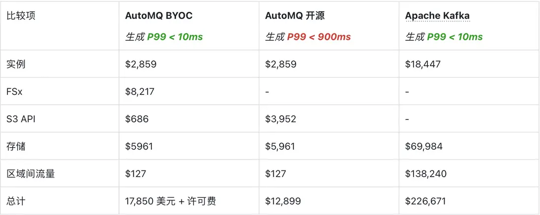 與 AutoMQ 開源(S3 直寫)的方案相比,引入 FSx 後雖然新增了約 8,000 美元的 FSx 成本,但 S3 API 調用開銷顯著下降,同時將 P99 從近 900ms 直接拉回到幾十毫秒量級,完成了“以極小的額外成本換取接近本地盤體驗的低延遲”的升級。這也説明,在 AWS 上選擇 AutoMQ + FSx,本質上是用一個可控、線性可預估的 FSx 成本,換取傳統 Kafka 難以實現的低延遲、多 AZ 高可用和跨 AZ 流量成本近乎歸零的綜合收益。