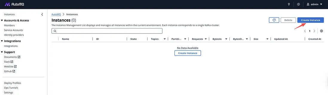 登入 AutoMQ 控制面的 Dashboard,點擊 Create Instance 按鈕開始創建集羣流程。