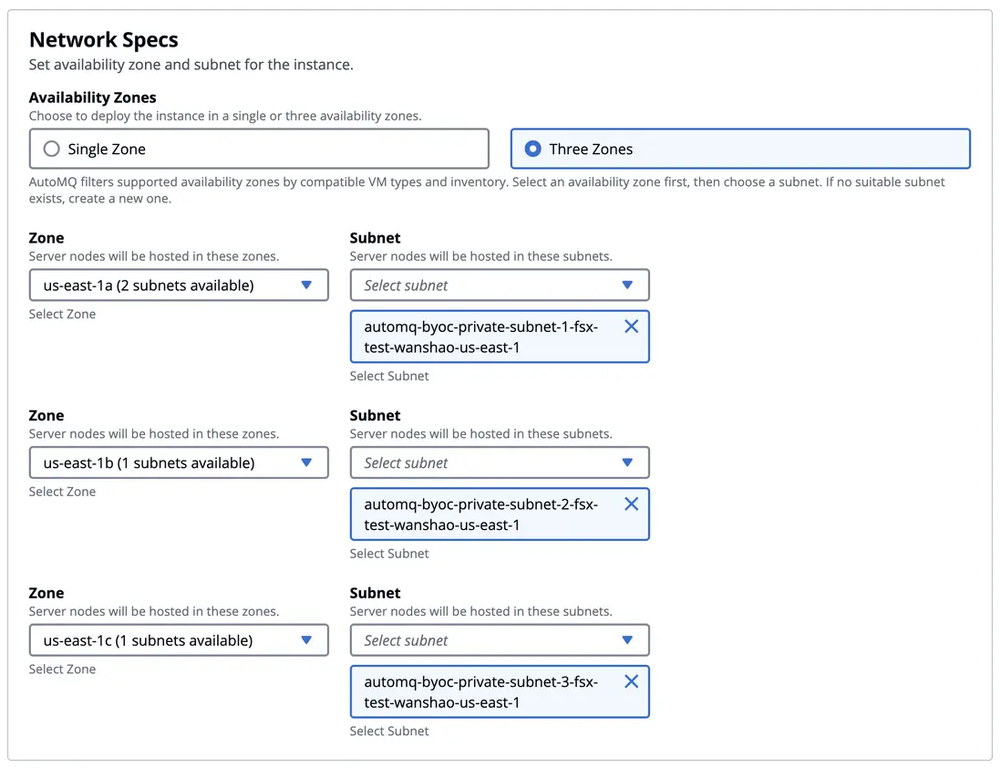 在集羣創建步驟 Network Specs 部分選擇 3 AZ 部署。在 AWS 上,如果選擇單 AZ 部署,我們仍然首先推薦使用 EBS WAL,它具有最佳的性能、成本表現。在多 AZ 部署的時候,考慮到跨 AZ 網絡傳輸成本,你可以選擇 S3 WAL 或者 FSx WAL。關於 AutoMQ 選擇不同 WAL 時在成本、性能上的差異請參考官方文檔[3]。