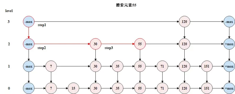 在跳錶中搜索一個元素時,需要從頂層開始,逐層向下搜索。搜索時遵循如下規則。