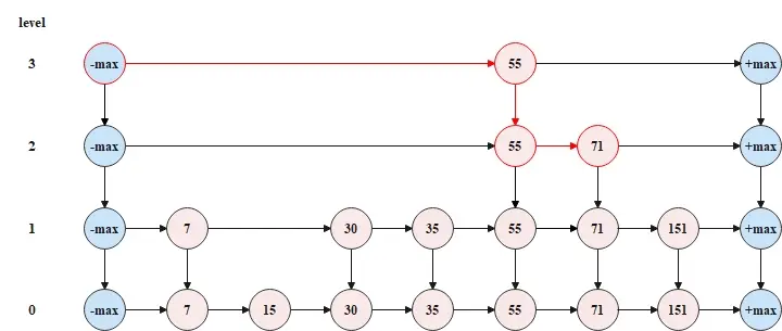 - 跳錶頭節點和尾節點不存儲元素,且頭節點和尾節點的層數就是跳錶的最大層數;