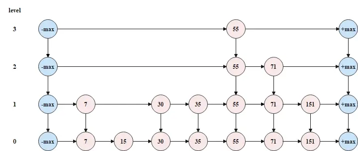 - 跳錶中的每一層都是一個有序鏈表,並且按照元素升序(默認)排列;