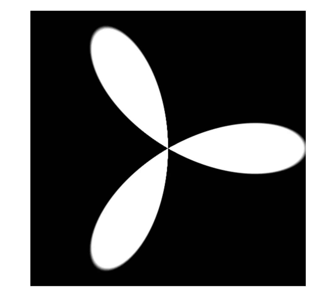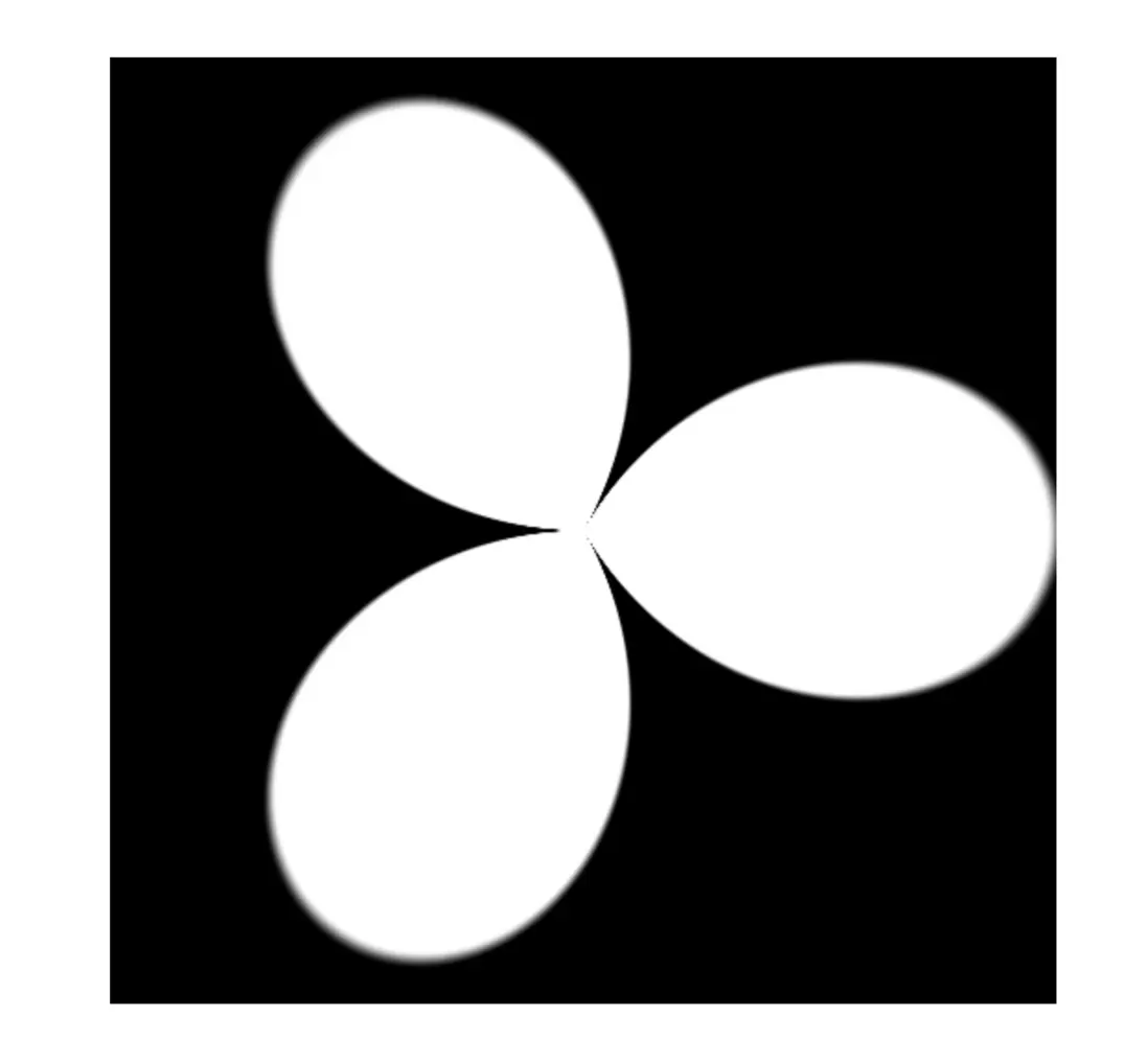 在這段Shader代碼中,這裏的0.5就是剛剛在Canvas例子中的a,而3.0就是Canvas例子中的k,所以這裏葉子的數目就是3。那為什麼這裏的d要這樣定義呢?這是因為玫瑰線上的所有點都滿足 0 = a * cos(k * θ) - r 這個等式,也就是説玫瑰線上的點對應的d都是0,並且玫瑰線形成的圖形內部的點對應的d都大於0,而外部的點對應的d都小於0,因此這樣我們就可以得到一個內部填充為白色的玫瑰線圖形。