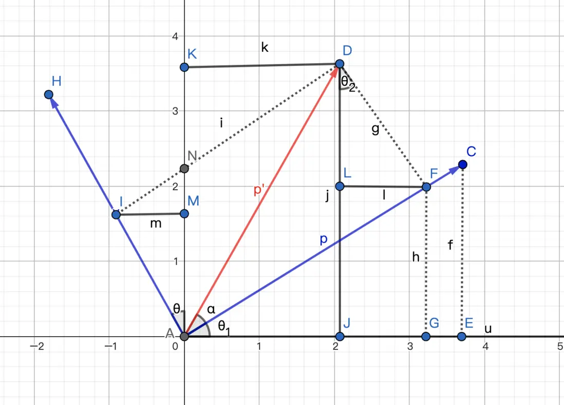 此時依舊看不出新舊座標之間的關聯,我們還需要繼續推導,求出向量P'在原座標系的值,在上圖中相當於我們要求出線段AJ和AK的長度。