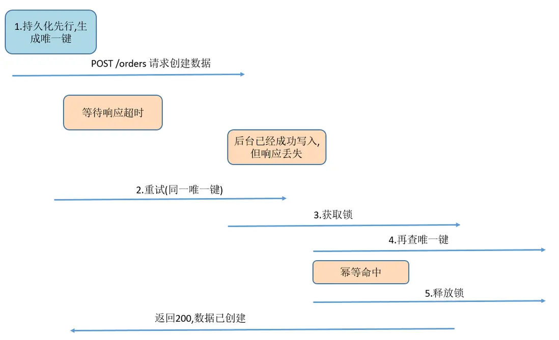 在上面的場景中我們可以觀察到,對於創建操作冪等的核心要義在於尋找唯一鍵和將唯一鍵進行持久化,唯一鍵的存在可以讓我們在超過處理時間,第三方發起重試的時候,用做分佈式鎖的key,來避免這類重試。而持久化的動機則在於避免我們的確認消費消息在網絡堵塞的情況下,超過調用方限制的超時時間,調用方發起重試。