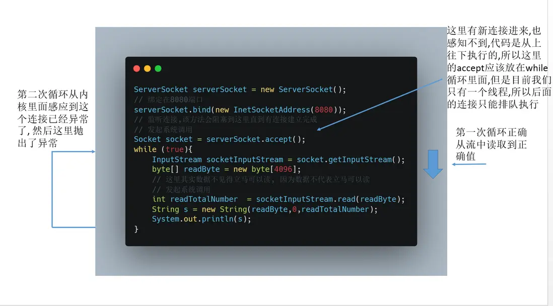 當然我們可以為每一個連接準備一個線程來處理,這也不是不能用,現在來説一些應用服務器還有停留在BIO模式的,但對於連接過多的,我們就需要考慮別的解決方案了,當然也有聰明的方法,我們可以每accept一個連接之後,將這個文件描述符放在一個數組裏面,然後弄一個新的線程去不斷遍歷這個數組,調用每一個元素的非阻塞read方法,這樣我們就可以用一個線程來處理多個客户端的連接。