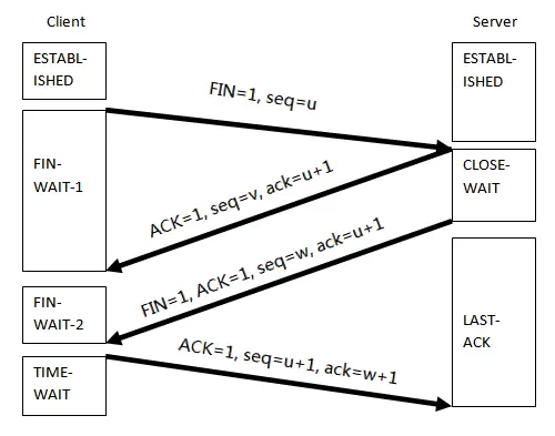 我們一邊寫這個一邊將我們的所學聯繫起來,在TCP協議中客户端主動關閉連接,發起系統調用之後,內核發一個TCP數據包,這個TCP數據包的終止位FIN置成1,序號seq = u,它等於前面已傳送的數據的最後一個字節的序號加1,這時Client進入FIN-WAIT-1(終止等待1)狀態,等待服務端的確認。