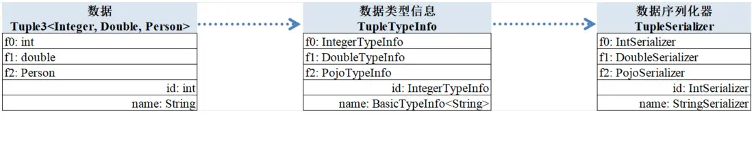 比如我們要在算子間傳遞一個Tuple3<Integer, Long, Person>的數據(其中Preson為由id和name組成的pojo類),則subTask對其進行序列化的關鍵步驟如下。
