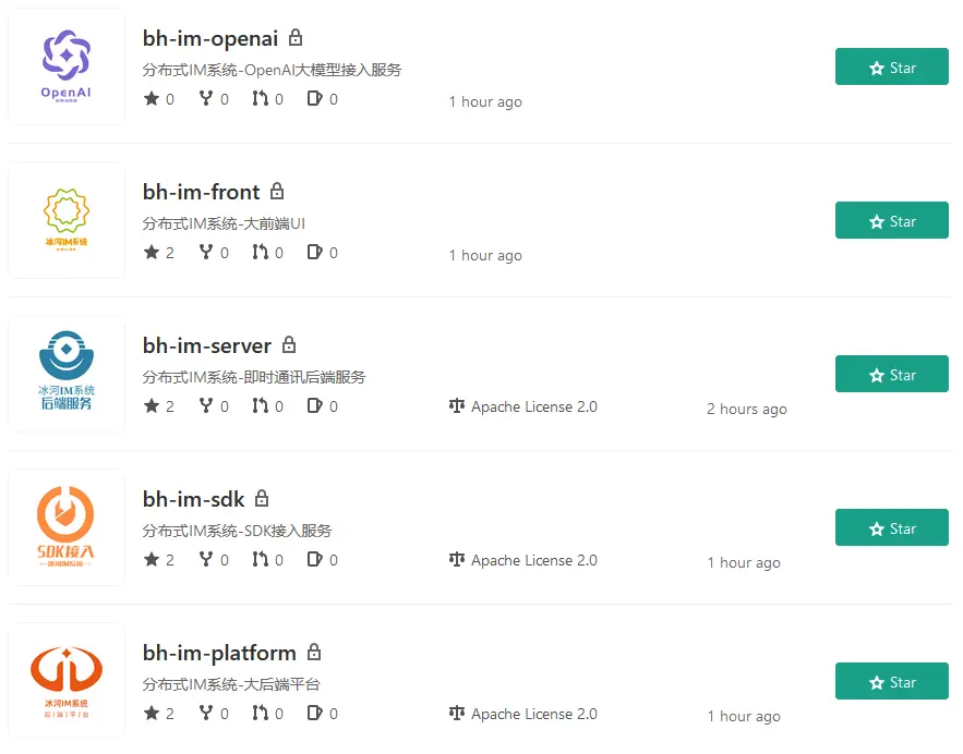 這次咱們啓動的分佈式IM即時通訊系統,首先,從項目的名稱上就可以看出來,它是支持分佈式的,可以在線上環境無限擴展,並且考慮到真實環境下即時通訊的需求,冰河會將整個分佈式IM即時通訊系統分為五大部分:即時通訊後端服務、大後端平台、SDK接入服務、OpenAI接入服務、大前端UI。