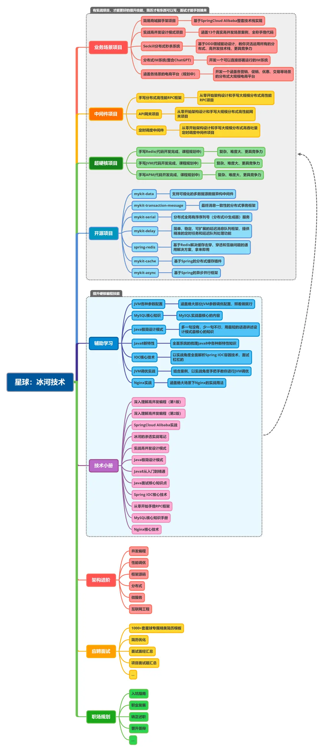 分佈式IM即時通訊系統是冰河技術知識星球諸多項目中的其中一個,還有很多其他項目,例如:簡易商城腳手架項目、Seckill秒殺系統、高併發設計模式等等,還有開源項目、技術小冊、1000+精美簡歷模板與面試技巧等(加入星球后直戳鏈接:https://t.zsxq.com/140wNNbz9)。詳情可以點擊放大下圖進行查看。