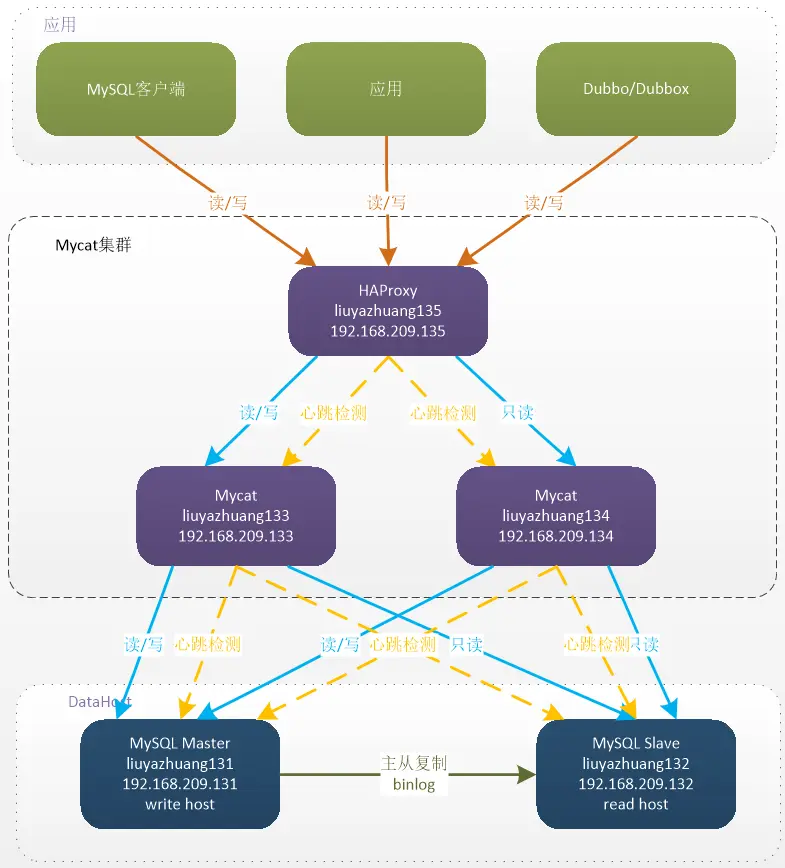 綜上: Mycat 的高可用及負載均衡由 HAProxy 來實現,而 HAProxy 的高可用,由 Keepalived 來實現。