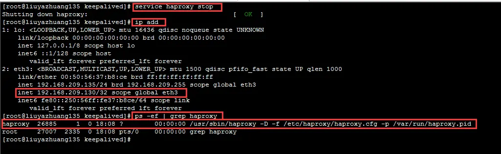 方式:把 192 節點中的 haproxy.cfg 文件重命名為 haproxy.cfg_bak, 並把 haproxy 服務進行 kill 掉,此時 keepalived 會嘗試去啓動 haproxy,會由於找不到配置文件而啓動失敗,此時就會進行 haproxy_check.sh腳本中的 killall keepalived 命令,結束 keepalived 進行。隨後就是 192.168.209.135 節點重新搶佔 vip