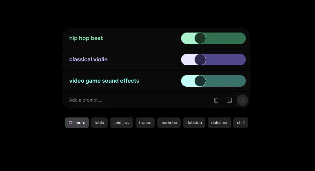 MusicFX DJ 的核心驅動力來自提示詞(Prompt)。在界面中部,可以找到 Add a prompt ... 輸入區域,此處支持兩種添加方式: