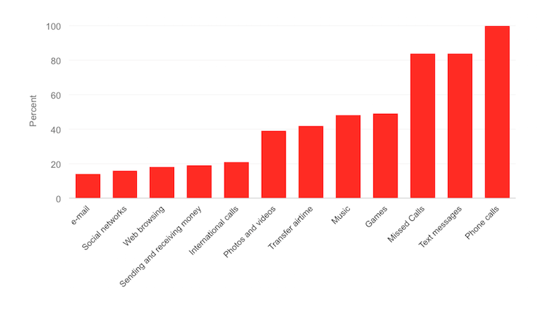 Unsurprisingly, phone calls and text messages were the primary use case, followed by missed calls. Across Africa and Asia, businesses encourage potential customers to send them a “missed call” — that is, to dial their number and then hang up. The business then phones the customer back, so that the cost of the contact is borne by the business, not the customer.