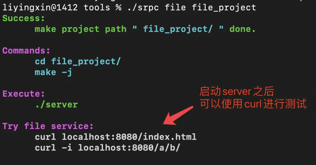 我們通過./srpc file file_project構建一下項目,我們可以通過curl命令去讀取想要的文件,例如curl localhost:8080/index.html 就可以讀取到指定root目錄下的index.html文件。