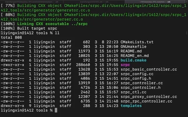 我們嘗試以默認方式構建一個RPC項目。也可以使用-f指定IDL文件進行構建,這會使用srpc_generator去進行代碼生成。