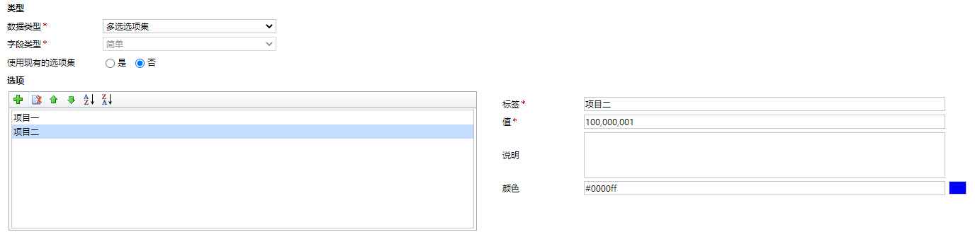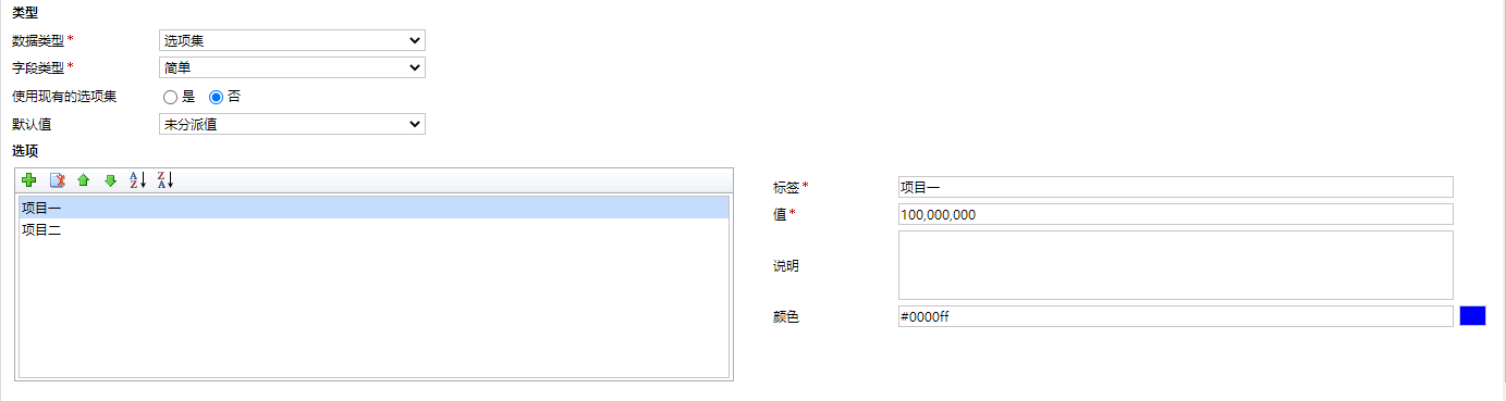 使用現有選項集:系統可以預定義一些公共選項集,選擇是後可以引用這些公共選項集提高創建選項集字段的效率。