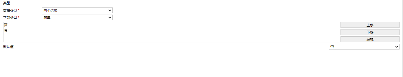 兩個選項默認是是與否,一般用於做是否選項以及二選一的類型比如男女等。存儲類型為布爾類型