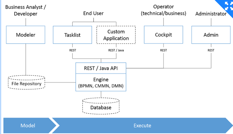 Camunda包括:流程設計器(Modeler)、流程引擎(Engine)、API接口(REST/Java API)、任務列表(TaskList)、流程管理控制枱(Cockpit)、系統管理工具(Admin)。