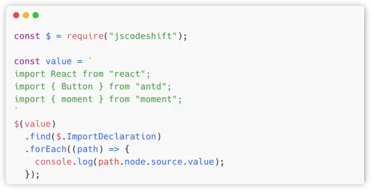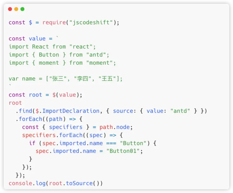 我們來看這段話的含義,代碼中我們通過引入 jscodeshift 來幫助我們解析和操作 AST 文件,然後在 API 中聲明瞭我們要查找元素的類型