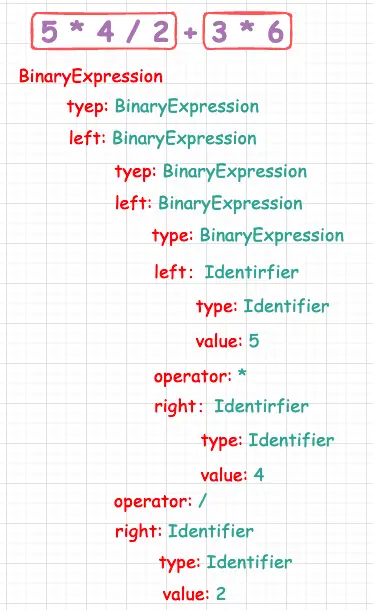 我們需要先定義下規則,如果遇到一個運算,我們就以 BinaryExpression 來表示,而 運算 中的結構自然就包含着 字符運算符 ,比如 5 * 4 這是一個運算,我們將整體標識為一個 BinaryExpression
