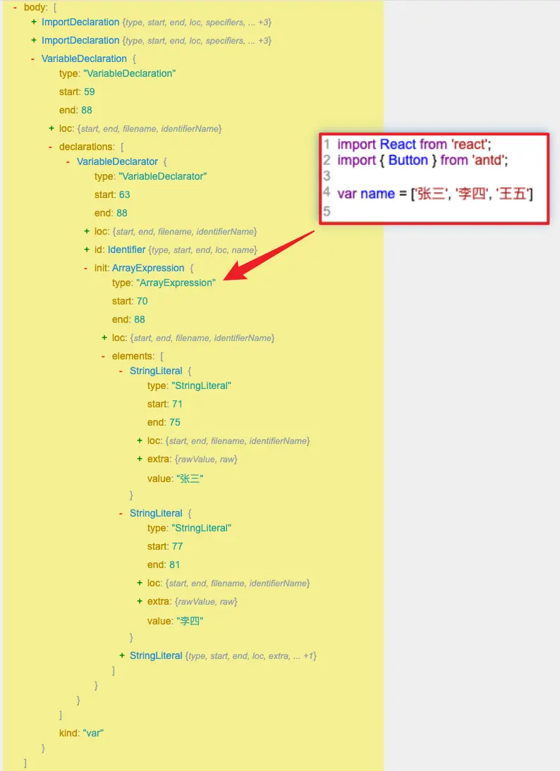 可以看到我們想要的內容在 ArrayExpression 中的 elements中,那麼接下來我們在代碼中該如何操作呢?大家可以先進行嘗試~