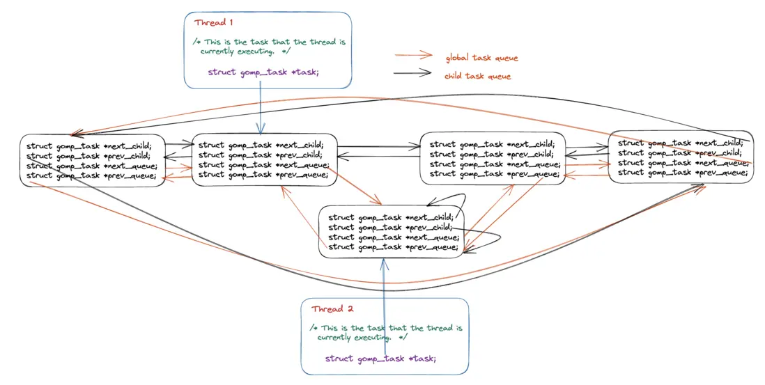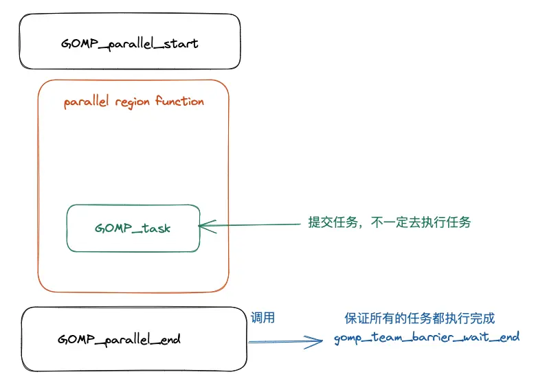 首先先捋一下整個程序被編譯之後的執行流程,經過前面的文章的學習,我們已經知道了並行域當中的代碼會被編譯器編譯成一個函數,關於這一點我們已經在前面的很多文章當中已經討論過了,就不再進行復述。事實上 task construct 和 parallel construct 一樣,task construct 也會被編譯成一個函數,同樣的這個函數也會被作為一個參數傳遞給 OpenMP 內部,被傳遞的這個函數可能被立即執行,也可能在函數 GOMP_parallel_end 被調用後,在到達同步點之前執行被執行(線程在到達並行域的同步點之前需要保證所有的任務都被執行完成)。整個過程大致如下圖所示: