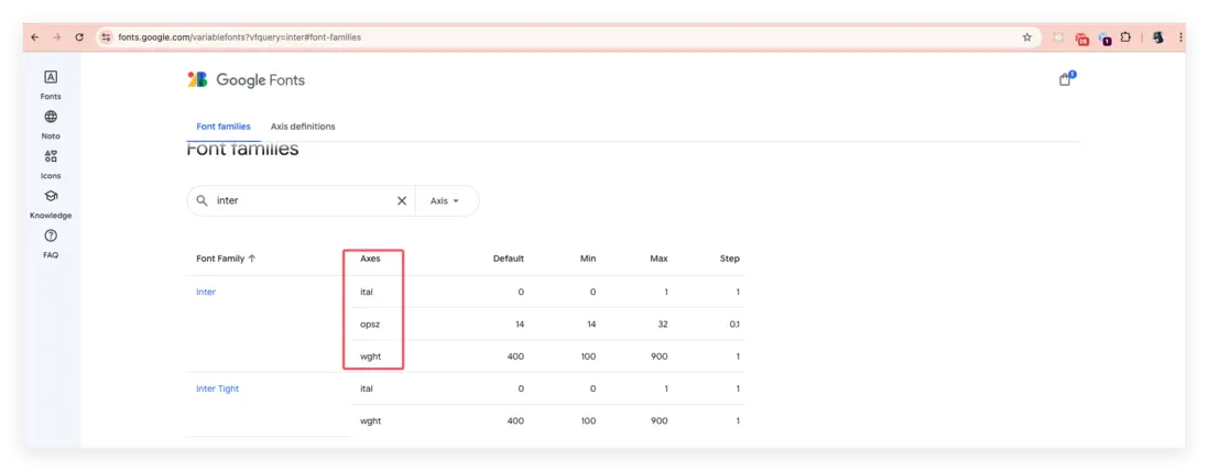 - 步驟三:找出可變字體的軸和範圍值。