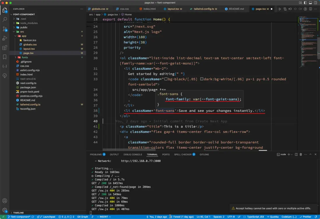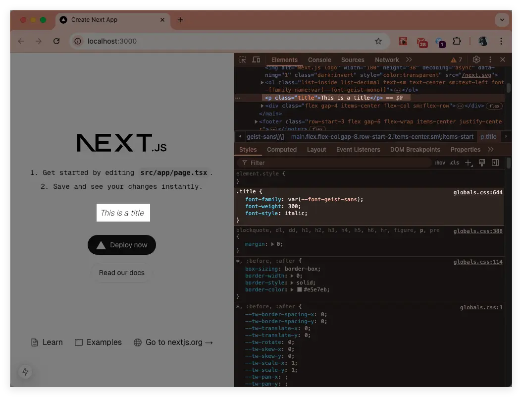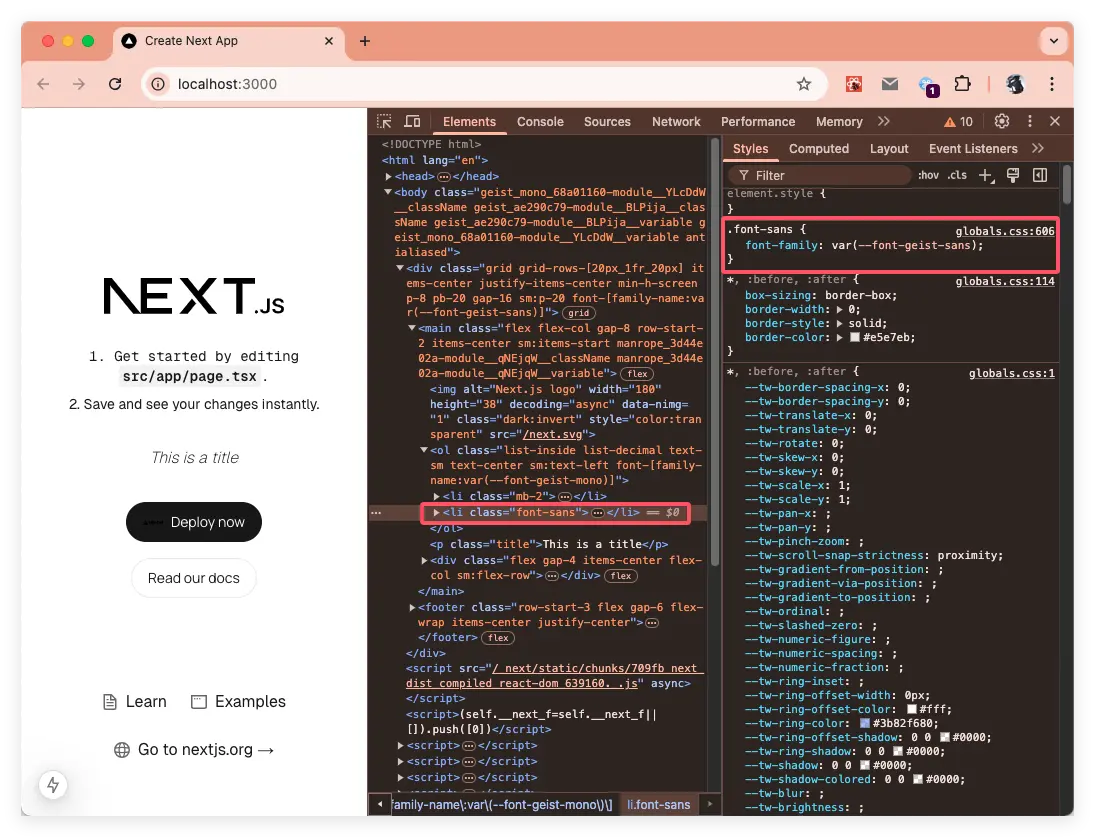 --font-geist-mono和--font-geist-sans兩個 CSS 變量,當需要使用的地方時就可以通過var()的形式引用:html { font-family: var(--font-geist-sans); } .title{ font-family: var(--font-geist-mono); }