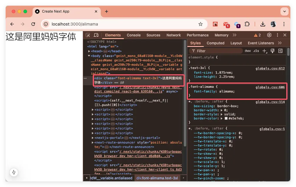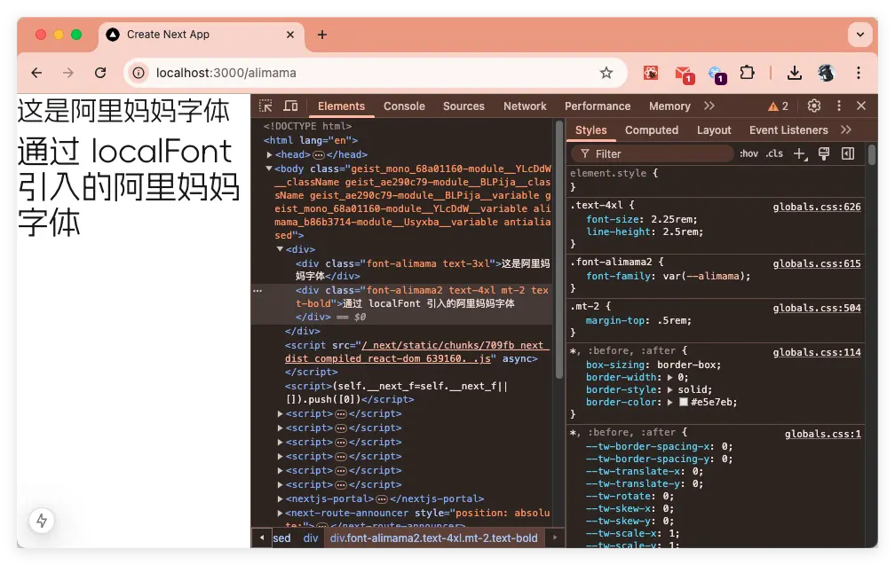 下載字體後,將字體放入項目中並在 globals.css 中引入,然後創建 alimama/page.tsx 文件。 如下圖: