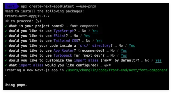 使用命令 npx create-next-app@latest --use-pnpm 創建一個新的項目;具體的項目配置選項如下:
