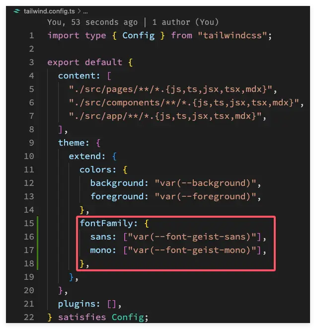 tailwind.config.ts配置中fontFamily: { sans: ["var(--font-geist-sans)"], mono: ["var(--font-geist-mono)"], },具體配置如下圖: