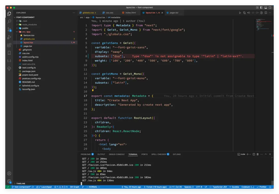上面這段代碼中,需要注意 subsets 這個屬性,谷歌的字體是可以指定子集(subset)的,目前 Next.js 官方網站上也沒有具體指出哪些字體支持那些子集,可以通過 next.js 源碼搜字體查看,在 packages/font/src/google/index.ts 中;還可以隨便寫一個,然後通過 TS 的類型推導校正,如下圖: