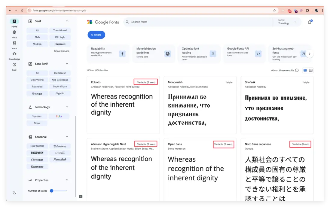 在 Google Fonts 可以查看到很多可變字體,篩選條件也很簡單(選中左側的 Variable),如下圖: