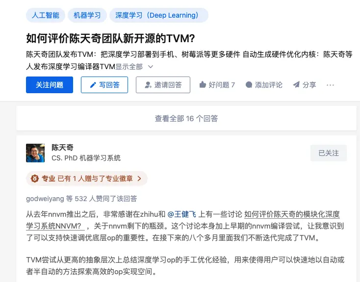 在知乎問題「如何評價陳天奇團隊新開源的 TVM?」中,陳天奇更是親自解讀,稱: