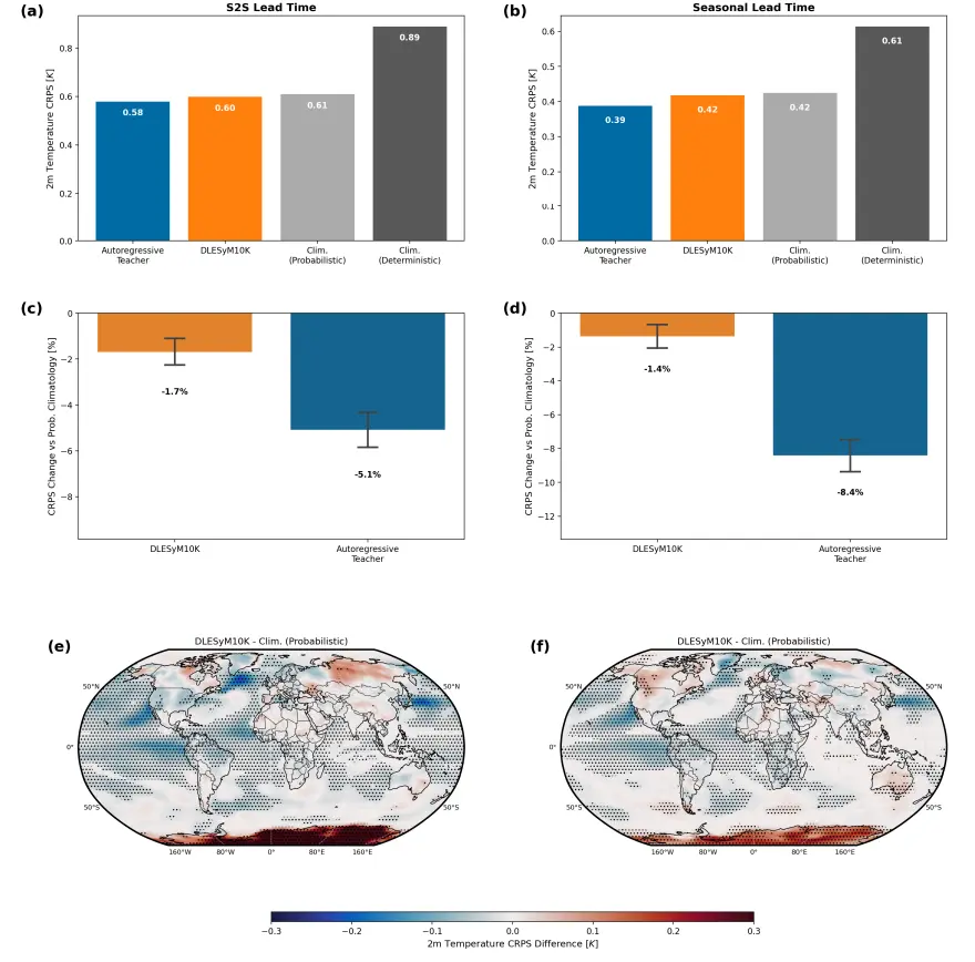 綜上所述,長距離蒸餾方法通過「數據縮放」與「單步概率建模」的結合,訓練出能單步輸出長期概率預報的條件擴散模型,並結合無分類器引導技術實現了靈活的不確定性校準。實驗表明,該方法在次季節至季節預報中已達到與歐洲中期天氣預報中心業務系統相當的性能。這一範式不僅為長期天氣預報提供了新方案,也為構建服務於氣候科學探索的通用生成模型奠定了基礎。