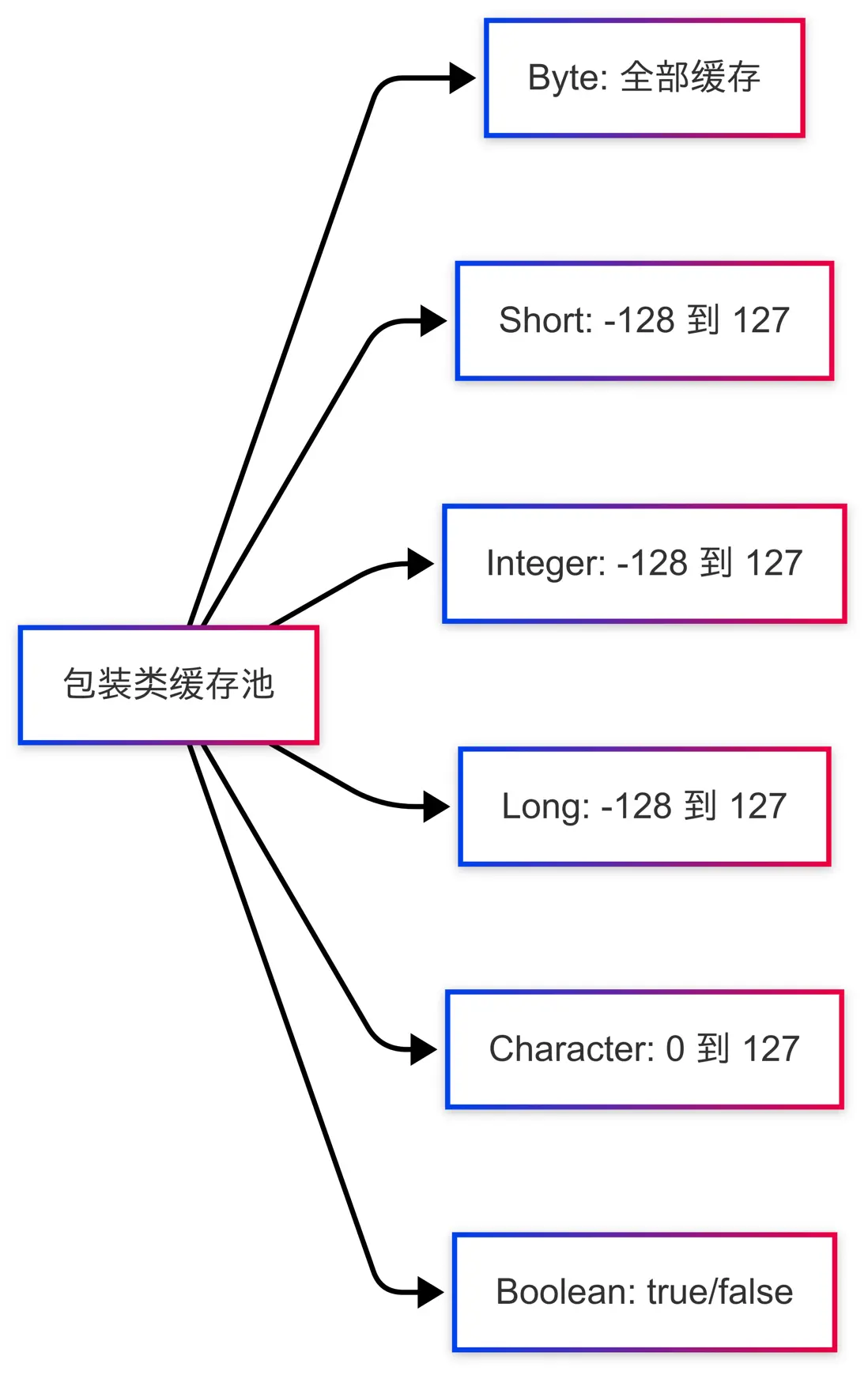 | Integer 緩存池 | JDK 內部維護的靜態緩存,存儲-128 到 127 範圍內的 Integer 對象 |