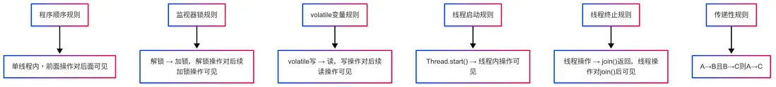 Happens-Before 原則是 JMM 的核心,它定義了操作之間的內存可見性。如果操作 A Happens-Before 操作 B,那麼 A 的結果對 B 是可見的。以下是一些重要的 Happens-Before 規則:
