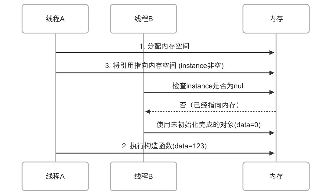 我特意調整了後兩個步驟的編號,以更直觀地對應重排後的順序。假設線程 A 執行到第 3 步時,instance 已經不為空了(但對象還未完成初始化)。此時線程 B 進入 getInstance 方法,發現 instance 不為空,就會直接返回 instance 並可能調用 getData 方法。但由於對象還未完成初始化,data 此時仍是默認值 0,而不是期望的 123,這就會導致程序讀取到未完全初始化的對象狀態,引發一系列業務邏輯問題。