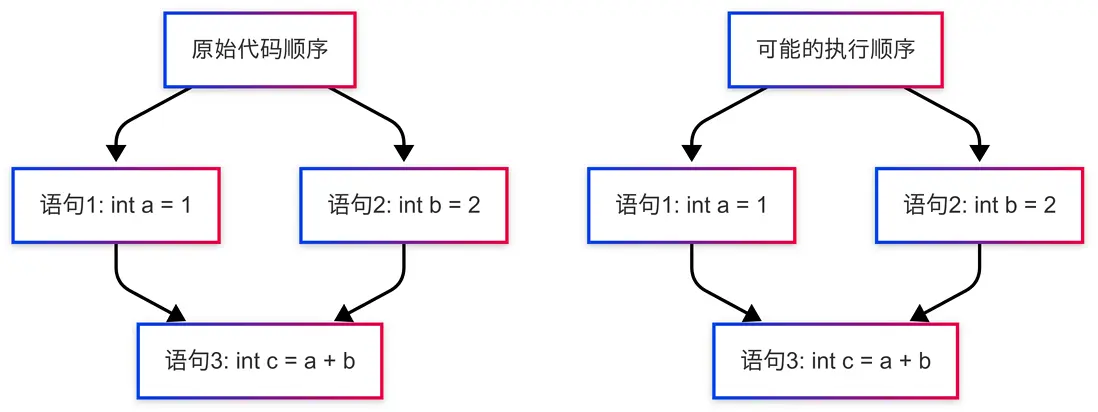 - 編譯器優化重排:Java 編譯器(包括 JIT 即時編譯器)在不改變單線程程序語義的前提下,重新安排語句執行順序,這受 Java 語言規範(JLS)約束。