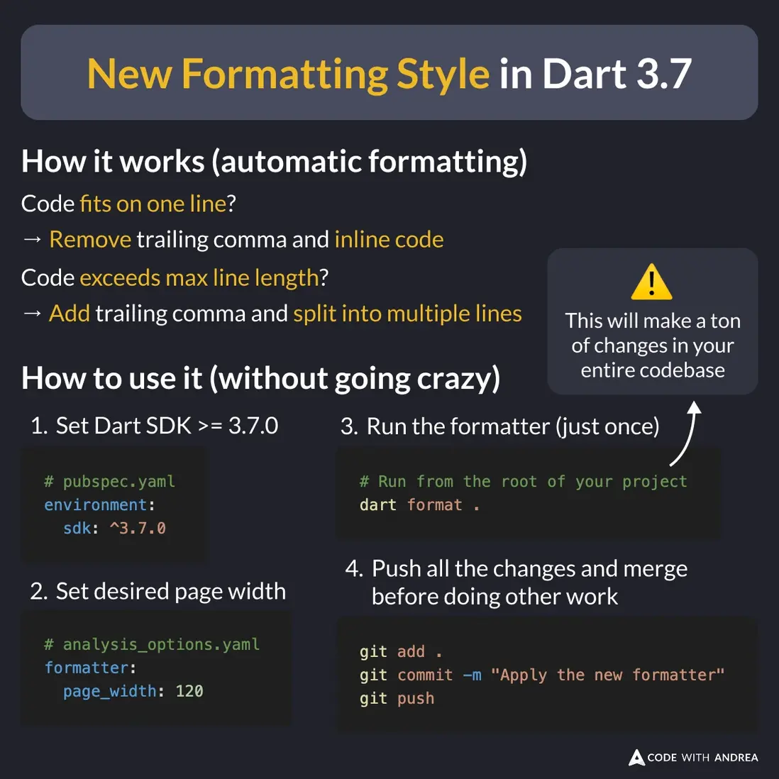 而Dart 3.7引入了新的格式化風格,會根據代碼是否超出最大頁面寬度自動決定是否添加尾隨逗號。