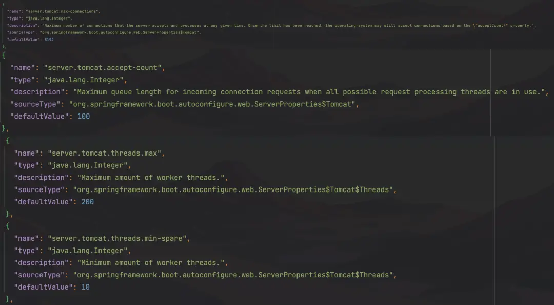 關於Tomcat的默認配置,都在spring-configuration-metadata.json文件中,對應的配置類則是org.springframework.boot.autoconfigure.web.ServerProperties