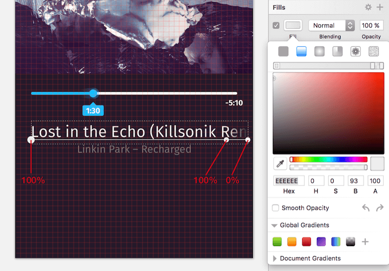 For the album cover, I didn’t have to think twice: Linkin Park has been my favorite band for a long time now, and I can’t stop listening to their remix album Recharged. Please note that all rights to the cover art are held by Linkin Park and Warner Bros. Records. Of course, you are free to use whatever cover you’d like — just make sure that it’s square. Drag it into Sketch (or copy and paste it), and move it to the top-left corner of the new artboard. To scale the image to the full width of the artboard, lock the aspect ratio first by clicking on the lock icon between the width and height fields. Then, enter “100%” in the width field, which will expand the cover to fill the whole width of the artboard. Rename it to “Cover.”