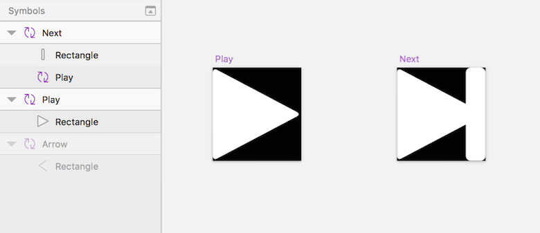 Now you can duplicate this symbol and rename it to next. Delete the triangle shape, and insert another “Play” symbol at the same place. To finish this control button, add a rectangle on the right side with a full height, a white fill, a width of 8 pixels and a radius of “2.” This will create a nested symbol that takes the arrow from the play symbol but adds another element on top of it. The moment you change it, all instances of this symbol will be modified, too.