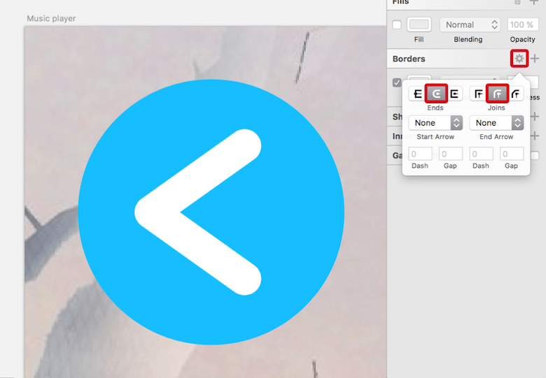 For the final look, set the border color to white, the position to “Center” and the thickness to “4.” Also, click on the gear icon above “Thickness” in the Inspector to open the border options, and set both the “Ends” and “Joins” to rounded (the middle icon for each). Finally, select both the circle and the arrow, right-click and pick “Align Middle,” followed by “Align Center”; after that, select just the arrow and move it a few pixels to the left to give it proper optical alignment and balance.