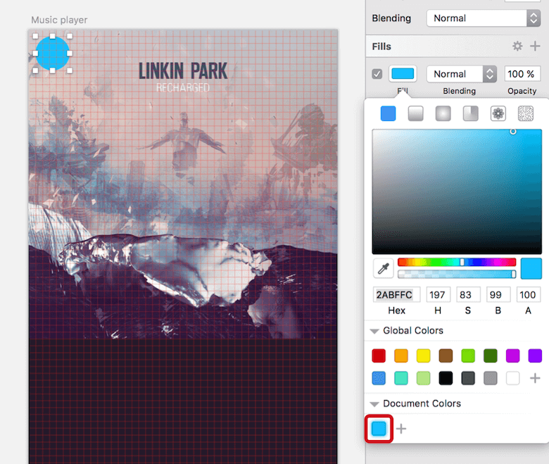 The first element we’ll add is the back button in the top-left corner. Press O to switch to the Oval tool, hold Shift, and drag a circle. Let it snap to the grid with a diameter of “40.” Jump into the Inspector with Alt + Tab, so that you can move it to an X and Y position of “8.” Both the shape’s dimensions and position will adhere to the grid now. With #2abffc, I’ve chosen a rather bright color, which contrasts well with the cover. Be sure to pick a color that does the same for the type of cover you’ve chosen. Add it to the “Document Colors” in the color dialog (with a click on the “+” icon), so that we can reuse it later. Finally, get rid of the default gray border with B.
