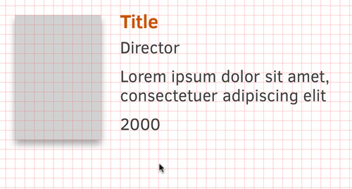 For the remaining two text layers — the year and running time — we can take the text layer of the “Director” as the base again. Duplicate it, move it down, so that there is another spacing of about 2 grid units from the description, but change the content to something like “2000” (so that we have a good indication of how long a typical year will be). As before, its baseline should align to the grid. Hold Alt, drag it to the right with the mouse to create another copy, and change this one to “|” to separate it from the year. You may also want to press Shift while dragging to keep it on the same line. Add the last layer in the same fashion, with “Running time” as the content. These text layers should have a horizontal spacing of about 4 pixels from each other.
