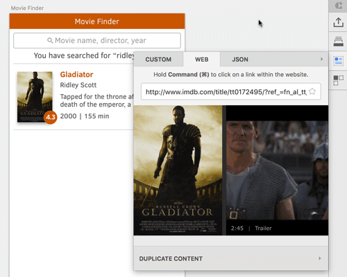 You can use Craft to fill not only text layers but also image layers. Unfortunately, selecting the “Poster” layer and clicking on the poster field in Craft won’t give us the desired result: it seems that the image path isn’t valid, so nothing more than the three dots (which usually act as a loading indicator) will be shown. Luckily, Craft can do even more: You can use the “Web” tab — which is basically just a browser — to navigate to a website and grab the poster from, say, IMBd. On the page for Gladiator, scroll down and click on the movie poster, which will assign the correct image to the placeholder on the artboard (make sure that it is selected first). In case you want to follow a link, you need to hold Cmd before clicking.