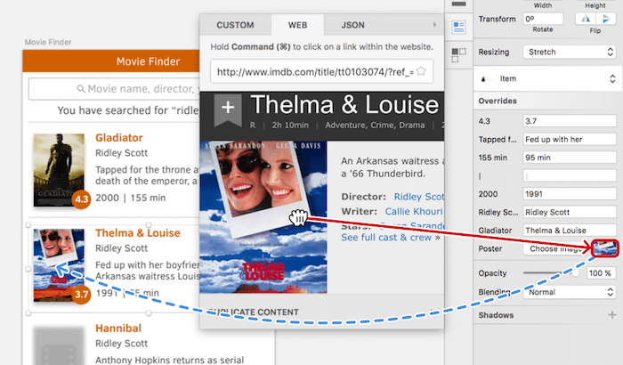 The poster problem needs a slightly different approach, however. Selecting the poster of each search result isn’t possible anymore when using a symbol. Instead, click on the small thumbnail next to the “Choose Image” button in the “Overrides” section of the Inspector panel. Navigate to the appropriate IMDb page from the “Web” tab in the Craft panel again, and drag the poster to this thumbnail. This will apply it to the respective instance of the symbol. Goal achieved!